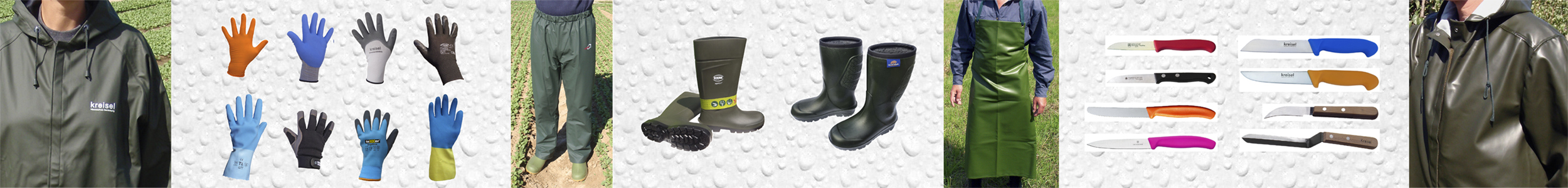 Weiterhin bieten wir Kälteschutzkleidung, Arbeitskleidung, Handschuhe, Gummistiefel, Messer und Zubehör an. Besonders hinweisen möchten wir auf die speziell für uns gefertigten Feldsalatmesser und Grünspargelmesser.